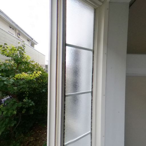 出窓と採光(確度83%):正面に大きめの出窓があり、左右は型ガラスでプライバシーを保ちつつ光を取り込めそう。