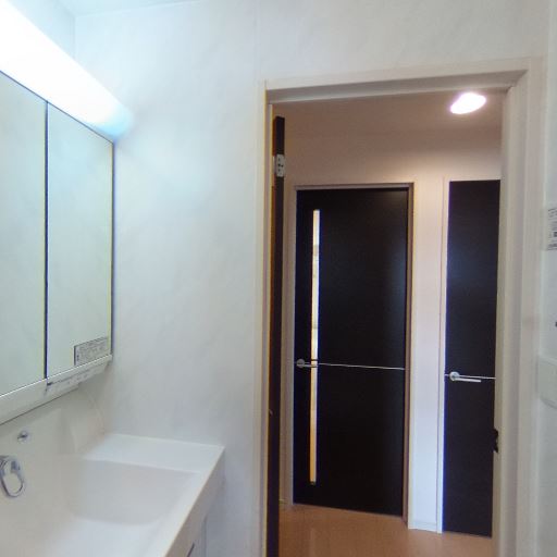 • 浴室が隣接し動線良好(確度80%):洗面脱衣所から直接バスルームに出入りでき、段差も小さい。