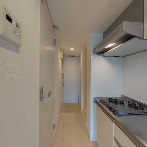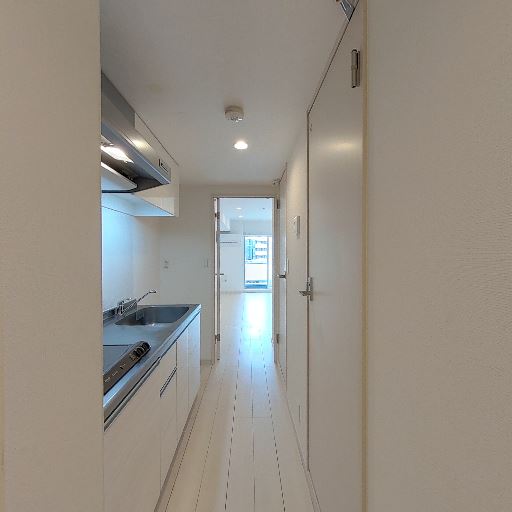廊下型のキッチン動線(確度76%):玄関から居室までの廊下にキッチンが配置され、通路幅はややタイト。開き戸や引き出しを開けると動線が狭くなる可能性。