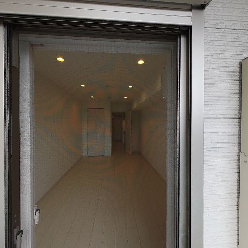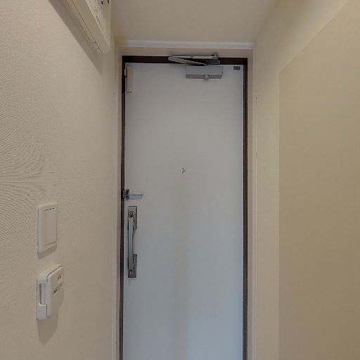 収納または冷蔵庫スペース(確度77%):玄関脇に奥行きのある縦長のくぼみがあり、上部にコンセントも見える。
