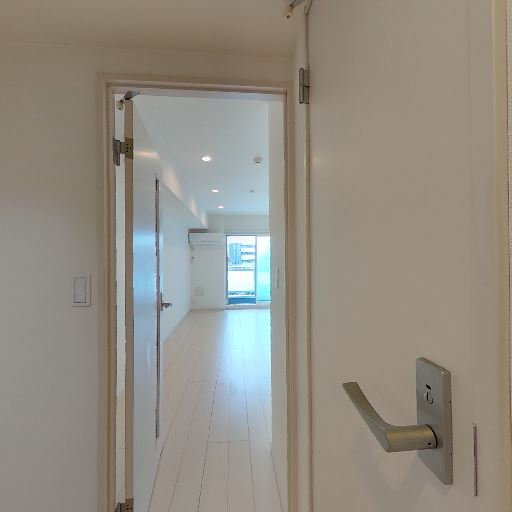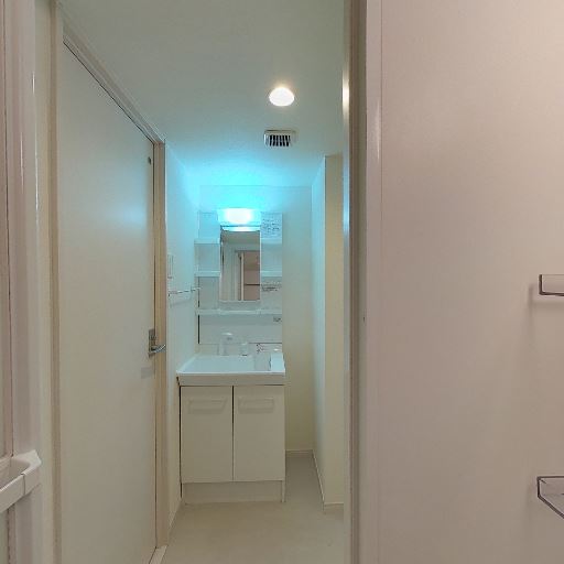洗面所への動線(確度83%):浴室扉の先に独立洗面台と通路が確認できる。
