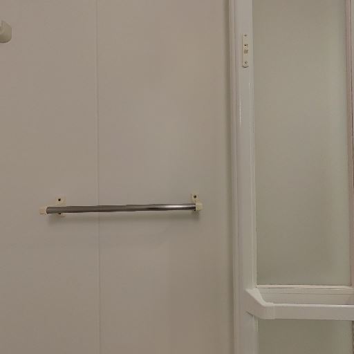収納・物干しバー(確度85%):壁面にタオル掛け/物干し用のバーが複数ある。