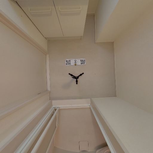 洗濯機置き場の位置(確度90%):床面に防水パンと給水・排水口、上部に吊戸棚があり洗濯機置き場と分かる。