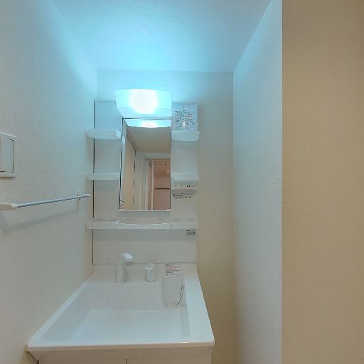 洗面所の採光は人工照明中心(確度70%):窓が見当たらず、天井照明と鏡上ライトで明るさを確保している。