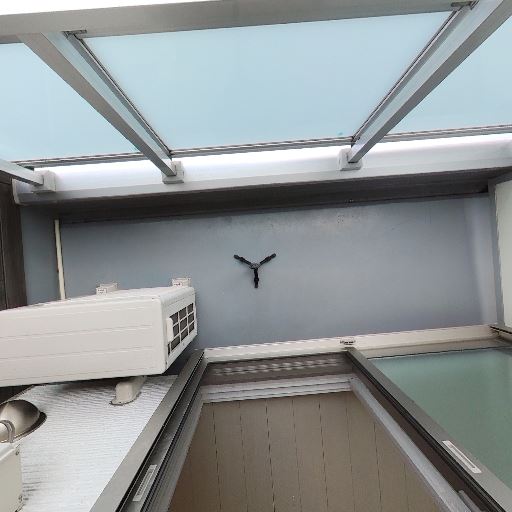 物干し金物と屋根付き(確度82%):天井に物干し金物があり、半透明の庇・屋根がかかっているため雨天時もある程度干せる。