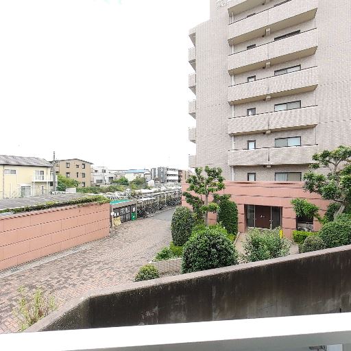 眺望と抜け感(確度76%):目の前は背の低い建物や通路で、正面に高層の圧迫感は少なく見晴らしがよい。植栽も見える。