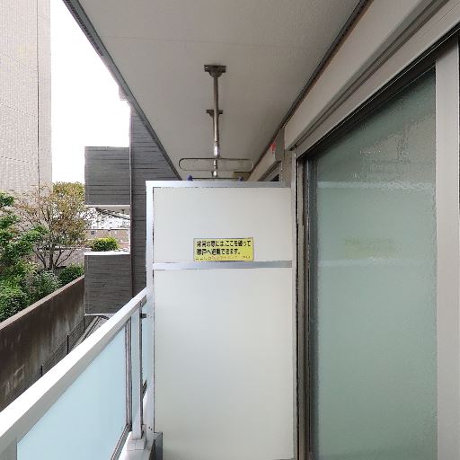 プライバシーと仕切り板(確度77%):隣戸との境に高い仕切り板があり視線を遮れる。注意書きがある通常の避難用の板に見える。
