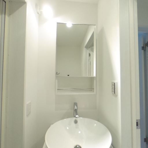 • 独立洗面台あり(確度90%):ボウル一体型の洗面台と鏡が設置されている。