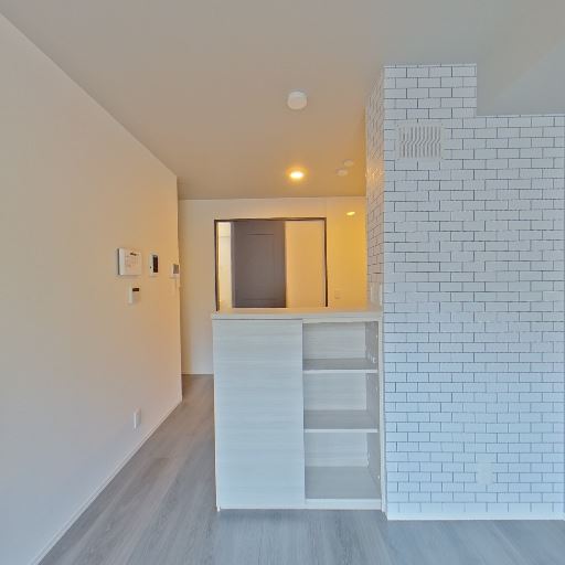 キッチンカウンターと収納棚(確度84%):白いタイル調の腰壁と一体のカウンターがあり、側面にオープン棚が付く。
