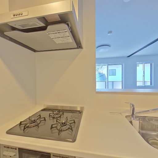 三口ガスコンロとレンジフード(確度90%):ビルトインの三口コンロと整ったレンジフードが確認できる。