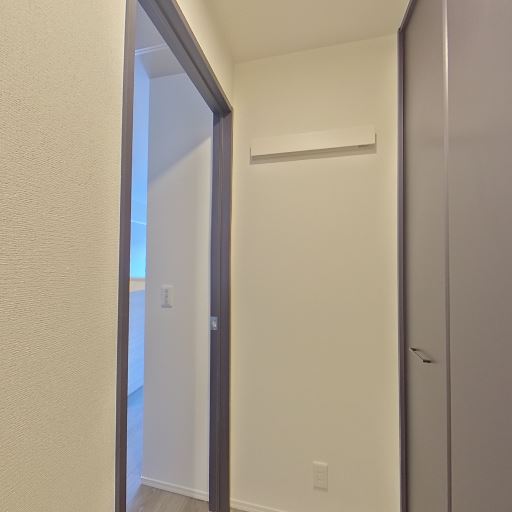 壁面フック/下地レールの備え付け(確度62%):廊下壁に横長の取り付けベースがあり、フック等を設置できそう。