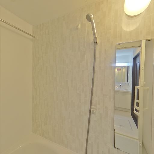 浴室が明るく追焚き等の設備も良好そう(確度75%):浴室内は明るく、シャワー・浴槽・棚が揃っている。壁面はパネルで掃除しやすそう。