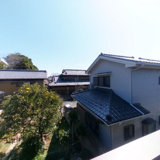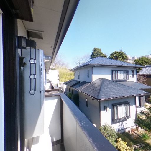 眺望と抜け感(確度82%):バルコニーから隣家の屋根越しに空が大きく開け、遠景まで視界が抜けている。圧迫感は少ない。