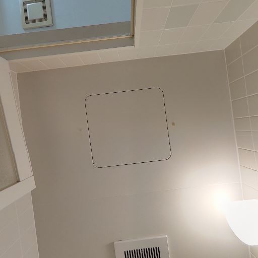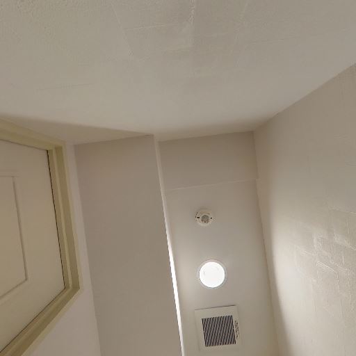 • 換気設備(確度80%):天井に換気扇が設置されており、丸型のダウンライトと併設。窓は見当たらない。