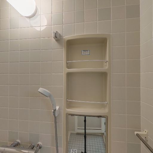 • シャワーと収納ニッチ付き(確度82%):ハンドシャワーとボトルなどを置ける埋め込み棚、ミラーが備わっている。