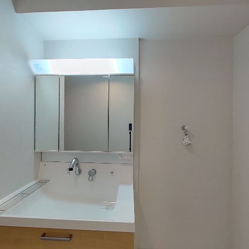 • 独立洗面台と収納付きミラー(確度88%):三面鏡タイプの独立洗面台で、鏡裏収納とカウンター下収納が確認できる。照明一体型で手元が明るい。