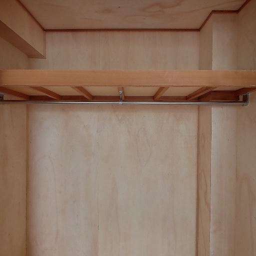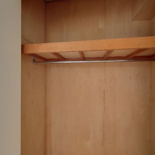 • クローゼットの収納(確度83%):ポールと上棚があるクローゼット。衣類のハンガー収納と布団・小物の置き場が確保されている。内部は木目で多少の使用感あり。