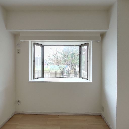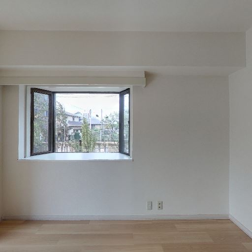 • 出窓と二重開き窓で採光良好(確度86%):奥行きのある出窓に左右の開き窓があり、外の緑が見える。日中は十分な自然光が入ると推測される。
