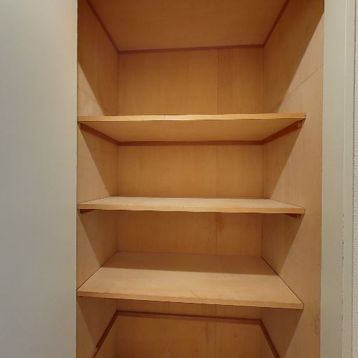 • 廊下に面した収納棚(確度86%):扉の内側に固定棚が4段あり、奥行きは中程度。日用品やリネン類の保管に適していそう。