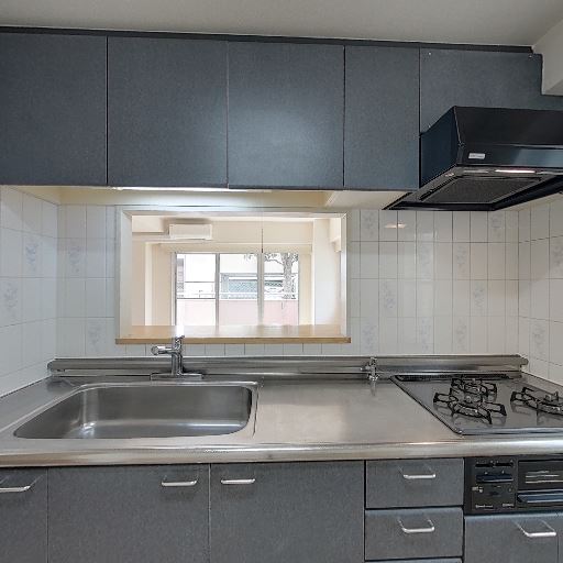 • キッチンの設備と状態(確度86%):シンクが広く、3口ガスコンロとレンジフードが設置されている。天板はステンレスで清潔感があり、収納も上下に豊富に見える。全体的に使用感は少なく良好な状態。