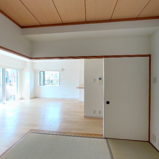 • リビングと続き間(確度77%):和室の引き戸の先に明るいリビングが続く一体空間になっている。