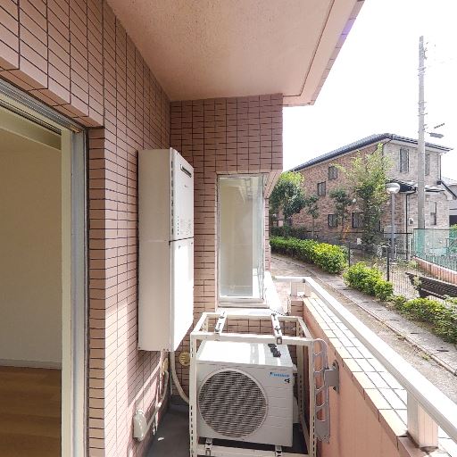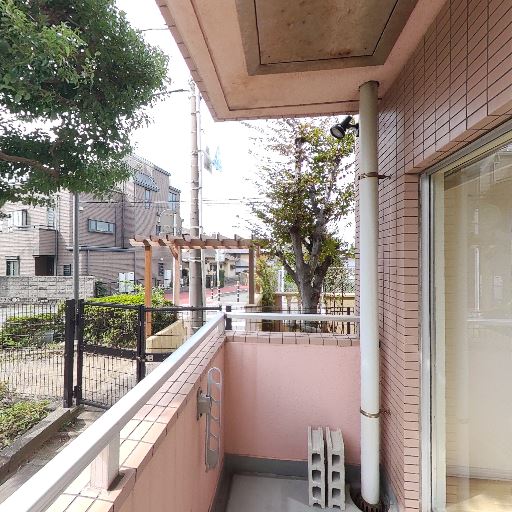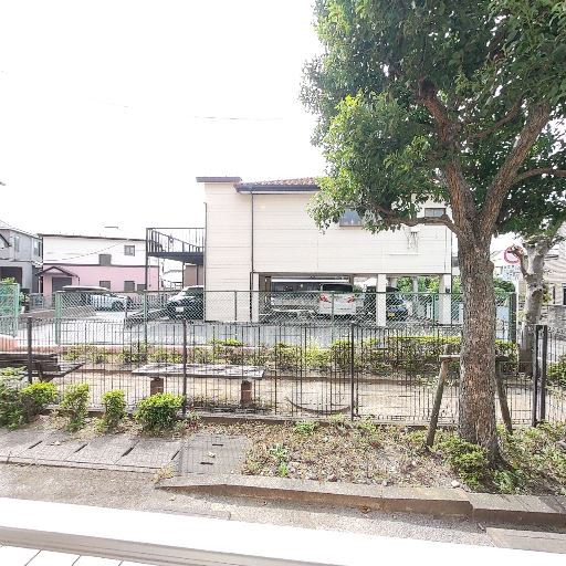 • 公園/歩道に面した1階バルコニー(確度83%):目の前が植栽とベンチのある公園や歩道で、フェンス越しに人通りがある。視界は比較的開けている。