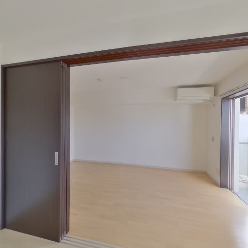 • 仕切り扉(引き戸)で空間可変(確度74%):濃色木目の引き戸があり、開けると隣室と一体化して広く使える。