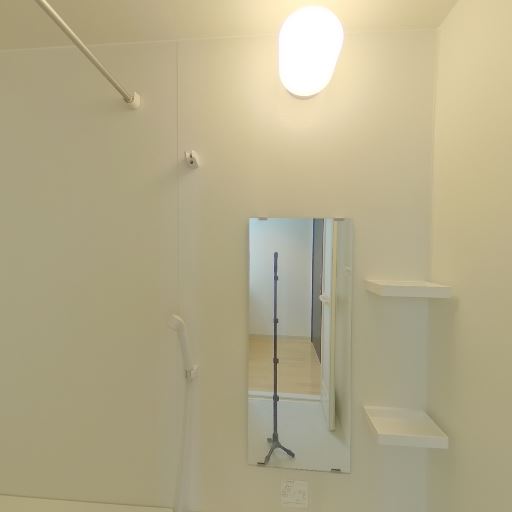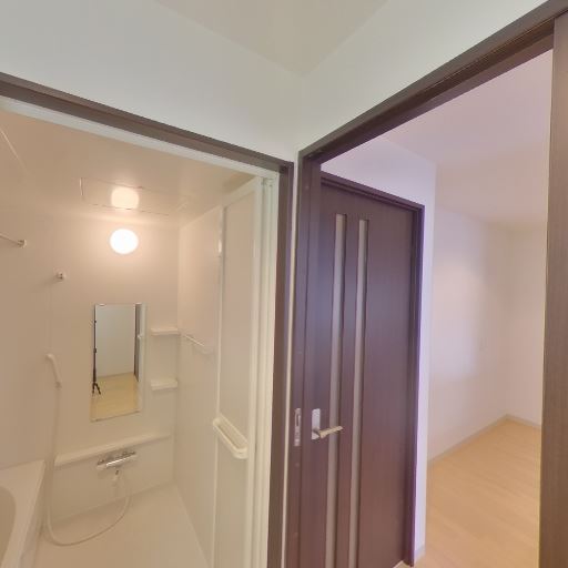 • 浴室が隣接(確度82%):引き戸の先に浴室があり、鏡・棚・シャワー設備が見える。