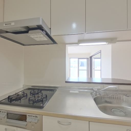 • キッチンの設備が充実(確度90%):ガス3口コンロ、グリル付き、シンク横に水切りラック、上部吊戸棚と下部収納が確認できる。