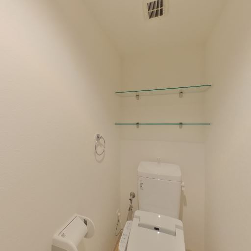 • 収納・棚の有無(確度82%):便器上部にガラスのオープン棚が2段あり、トイレットペーパーや小物を置ける。