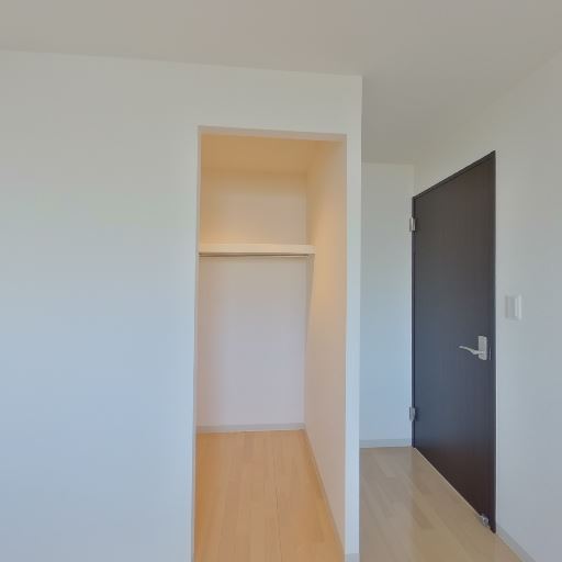 • 収納スペース(クローゼット)あり(確度86%):壁面に奥行きのあるオープンクローゼットが設置されている。ハンガーパイプと上部棚が確認できる。