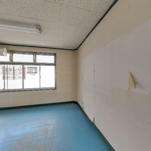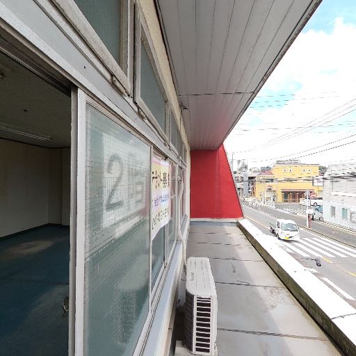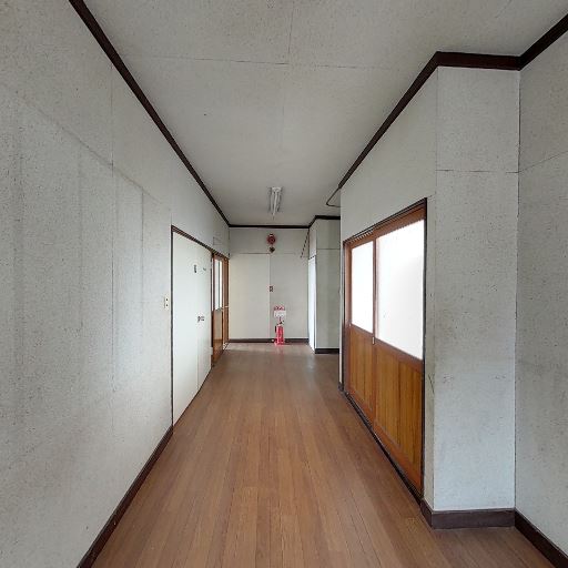 共用廊下のような細長い空間(確度78%):奥行きのある細い通路で、片側に窓と腰壁、反対側は壁と扉が並ぶ。住居の個室というより事務所・テナントの通路的な造り。