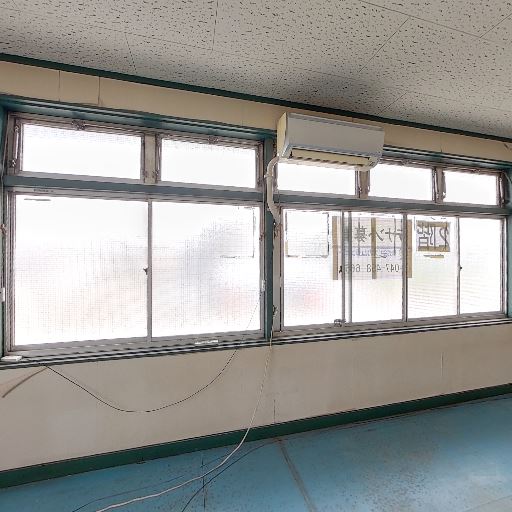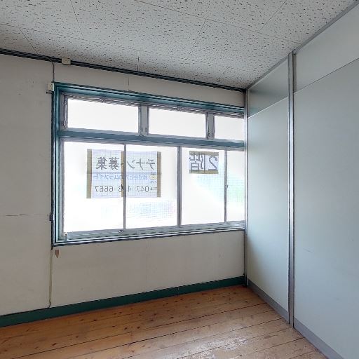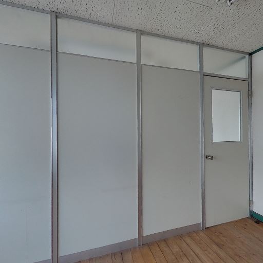 内装の古さ・パーティション壁(確度84%):金属枠のパネル壁と欄間付きの造作、古めの引き戸があり、全体的にレトロな事務所仕様。