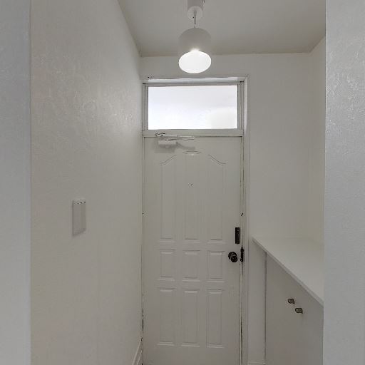 玄関上部の採光が期待できる(確度84%):玄関ドア上部に横長の明かり取り窓があり、日中は自然光が玄関側に入る可能性が高い。