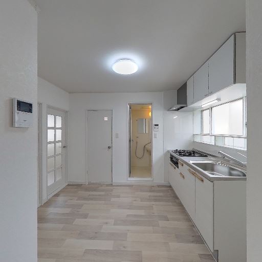 キッチンまわりが明るく清潔感がある(確度89%):白を基調とした内装と明るい床材により、空間全体が清潔で見通しよく感じられる。キッチン面にも窓があり、閉塞感は比較的少ない。