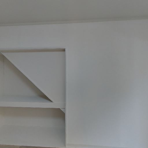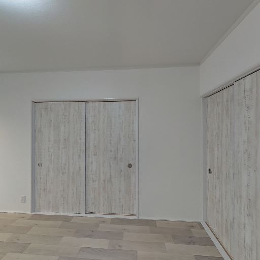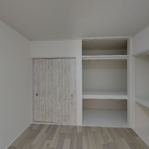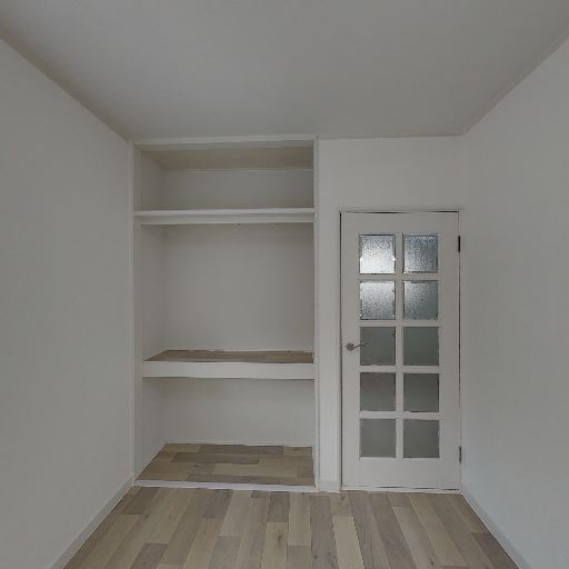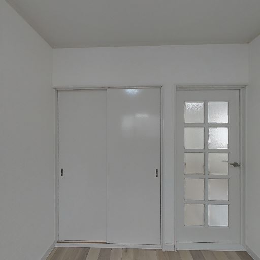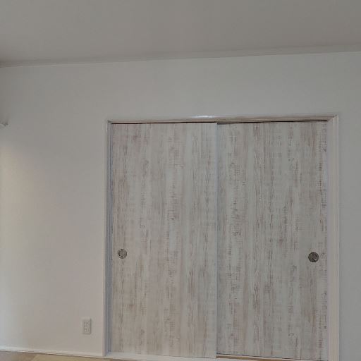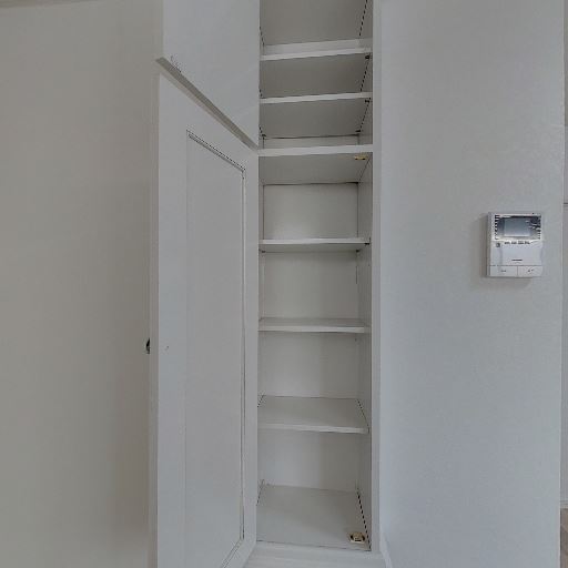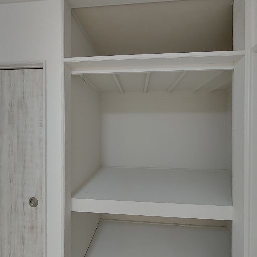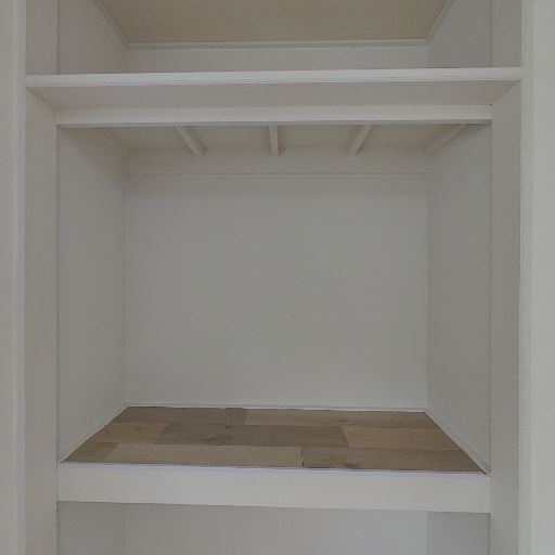 ロフト下または勾配天井下の変形収納がある(確度87%):右側の収納内部は天井面が斜めに下がっており、収納空間の一部が三角形状になっている。奥行きはあるものの、収納物の形を選ぶ可能性がある。
