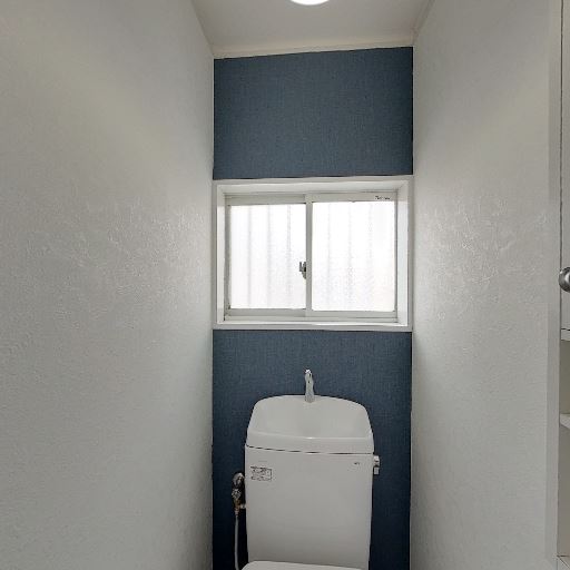 アクセントクロスで単調すぎない印象(確度84%):便器背面の壁が濃いブルー系のアクセントクロスになっており、空間にメリハリがある。