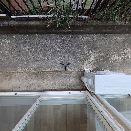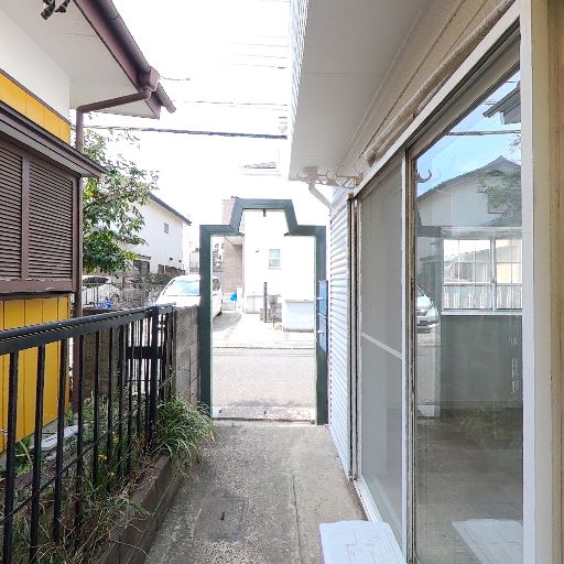 掃き出し窓があり外への出入りはしやすそう(確度92%):室内に面した大きな掃き出し窓があり、すぐ外の通路へ出られる構造に見える。開口部が大きく、換気や荷物の出し入れはしやすそう。