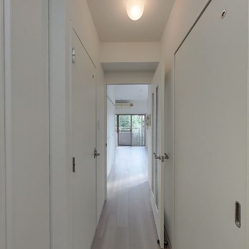 • 天井照明・ダウンライトあり(確度70%):廊下天井に丸型シーリングライトと小型ダウンライトが複数見える。
