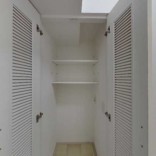• 洗濯機置き場と上部収納(確度86%):折れ戸の内側に洗濯機パンと給排水があり、その上に可動棚が2枚設置されている。洗剤やタオルの保管に使えそう。
