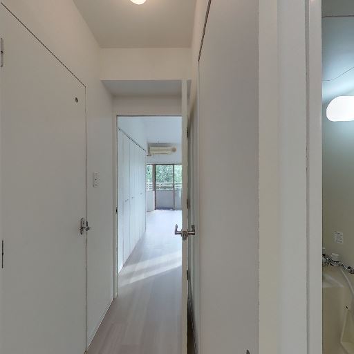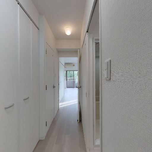 • 玄関から居室への一直線の動線(確度74%):廊下が細長く、突き当りに居室の窓が見える。右側は浴室らしき扉、左側に収納が並ぶ。