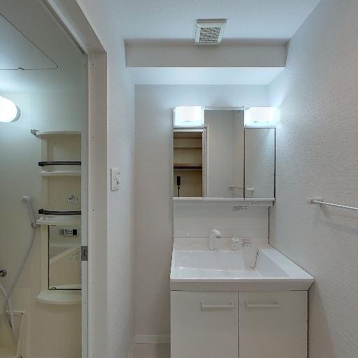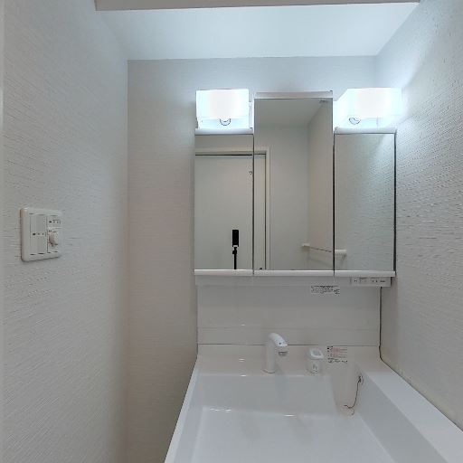 • 独立洗面台と三面鏡収納(確度86%):照明付きの三面鏡と広めの洗面ボウルがあり、鏡裏収納も期待できる。