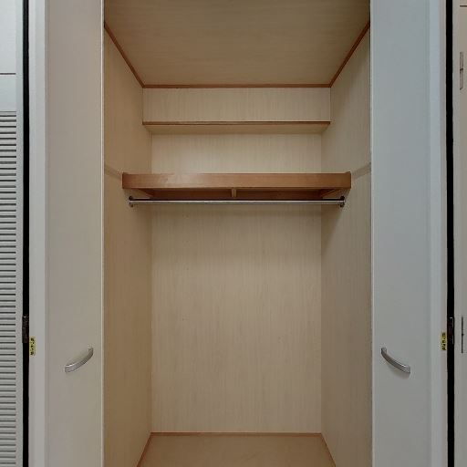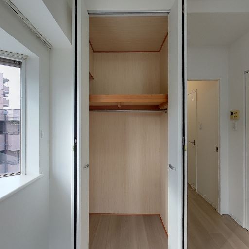 • クローゼット収納(確度86%):折れ戸のクローゼットがあり、中段棚とハンガーパイプ付きで奥行きも十分に見える。