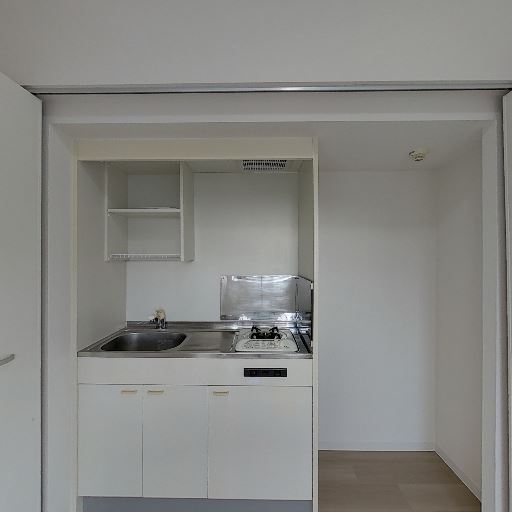 • キッチンはコンパクトだが2口コンロ(確度86%):シンクと2口ガスコンロ、調理スペースが一体のミニキッチン。上部に換気扇とオープン棚がある。
