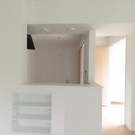 キッチンカウンターと小棚(確度77%):カウンター越しのキッチンと壁面の造作棚が見える。小物やルーター置き場に便利。