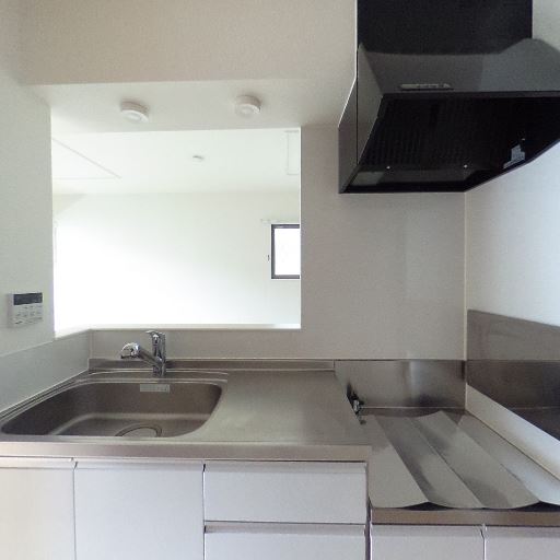 キッチンの設備・状態(確度86%):シンクとコンロ横の作業台、レンジフードが新しめで清潔に見える。ステンレス天板で手入れしやすそう。
