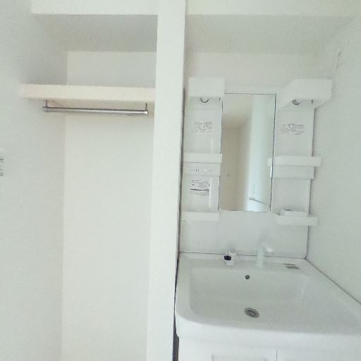 独立洗面台と収納(確度85%):鏡付きの独立洗面台があり、横に棚とハンガーパイプ付きの収納スペースがある。