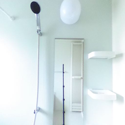 シャワー・ミラー・収納棚(確度83%):ハンドシャワー、縦長ミラー、コーナー棚が設置されている。