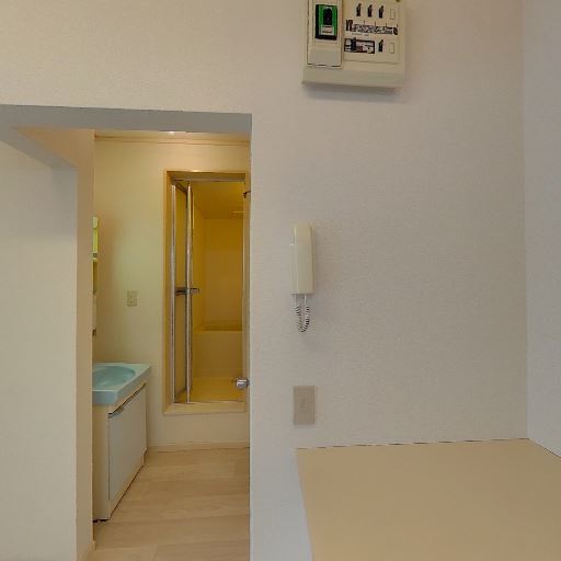 脱衣所からキッチン・居室へ直通(確度77%):洗面所のドアを開けるとキッチンと居室が隣接して見える動線。
