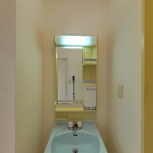 独立洗面台あり(確度86%):鏡付きの独立洗面台が設置され、棚や小物置きが付属している。